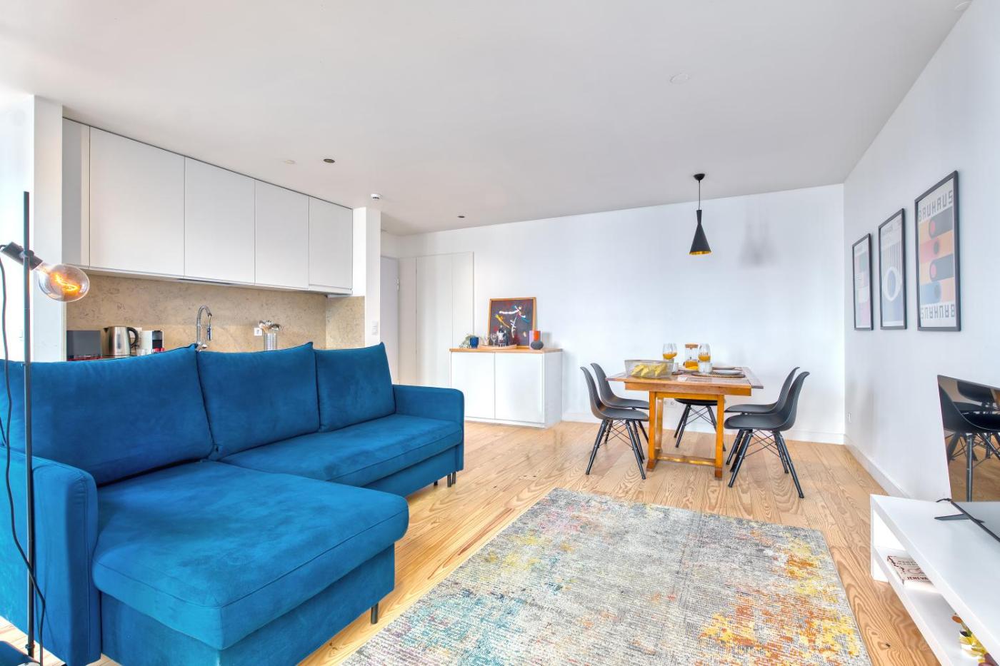 Estúdio King com Sofá-cama. Offering free toiletries and bathrobes, this studio includes a private bathroom with a walk-in shower and a hairdryer. The well-fitted kitchen has a stovetop, a refrigerator, a dishwasher and kitchenware. The air-conditioned studio offers a flat-screen TV with cable channels, a washing machine, soundproof walls, a tea and coffee maker as well as ancourtyard view. The unit has 2 beds. ;